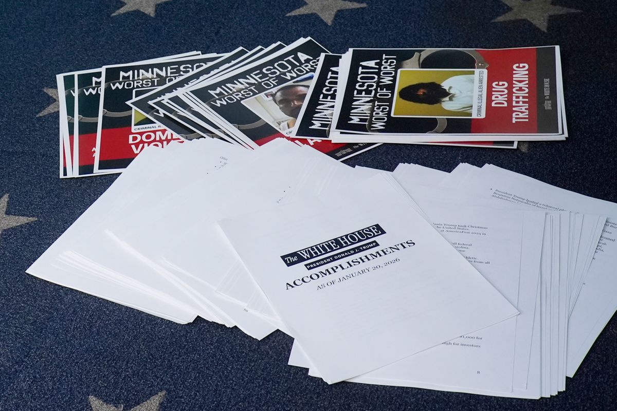 President Donald Trump marked his first year back in office highlighting his accomplishments before world leaders in Davos, Switzerland, on Wednesday and during an appearance in the White House press briefing room Tuesday, making false and misleading claims about the state of the U.S. economy, Greenland, foreign policy, energy and other topics.