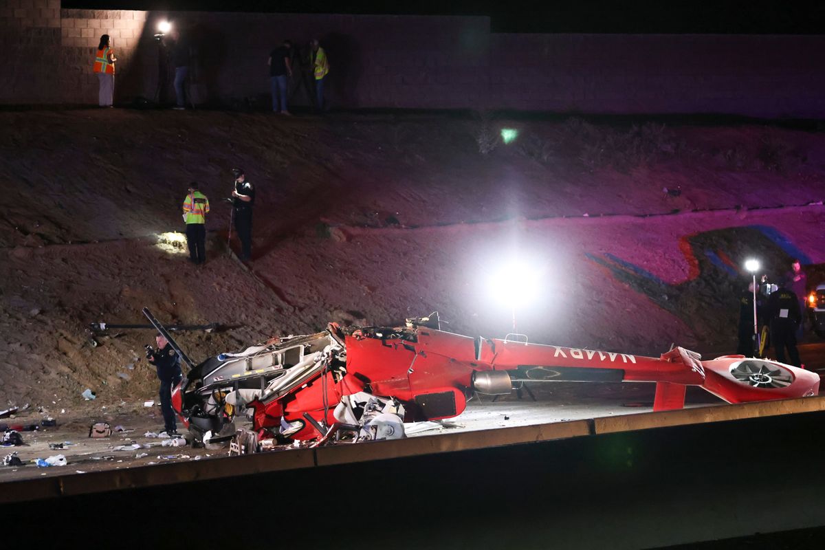 Firefighters said they didn’t confirm the helicopter caught fire. White smoke billowed out of the aircraft when it crashed, but Vandersluis said it was released by an onboard fire extinguisher system.