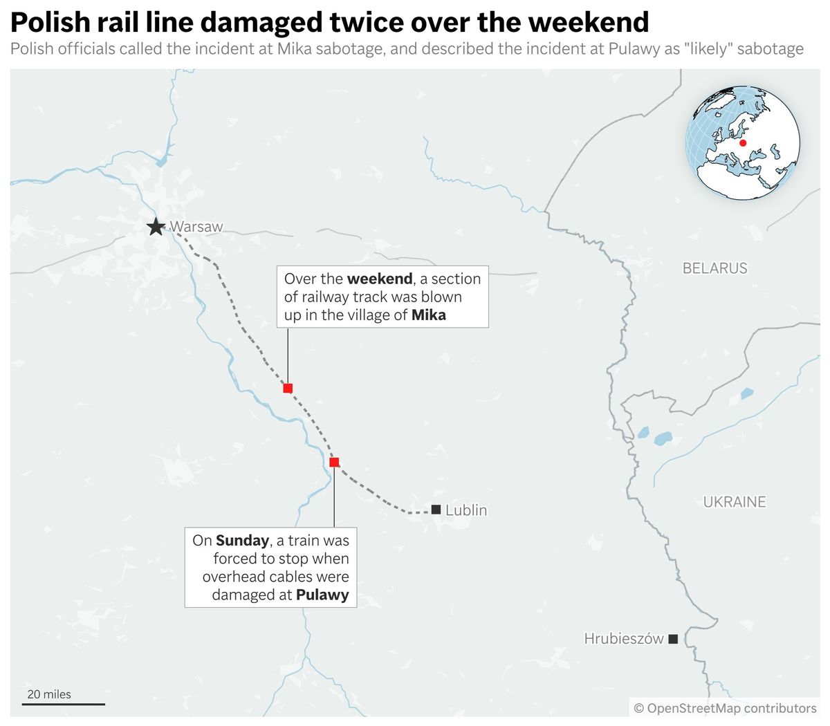 In the first incident, an explosion damaged the tracks near the village of Mika, about 100 kilometers (60 miles) southeast of Warsaw and, in a separate incident, power lines were destroyed in the area of Puławy, about 50 kilometers (30 miles) from Lublin. Trains carrying passengers were forced to stop at both locations, but no one was hurt.