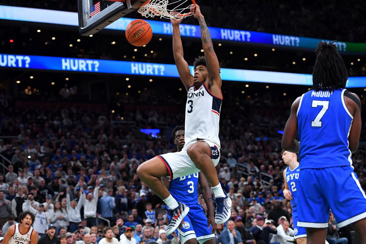 UConn led 82-77 when Dybantsa dropped in a layup with under a minute to play. Two free throws by Demary made it 84-79, but a 3-pointer by Dawson Baker cut the margin to two.