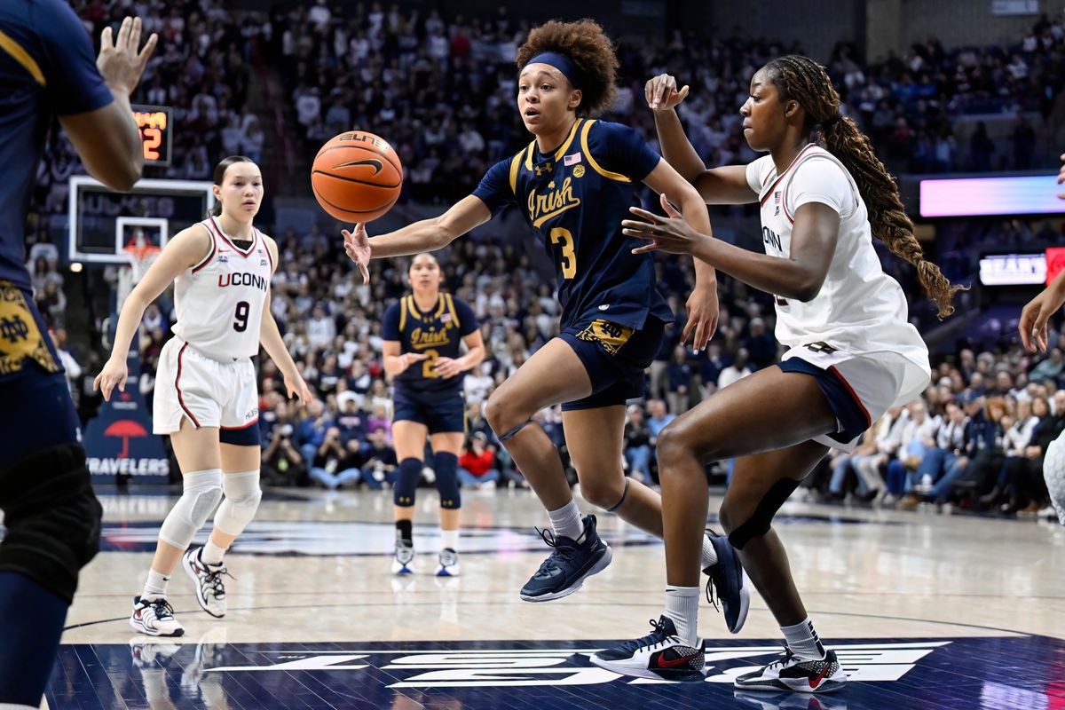 Notre Dame missed its first seven shots and the Huskies jumped out to an early eight-point lead. A basket by Arnold gave the Huskies their first double-digit point lead late in the first quarter.