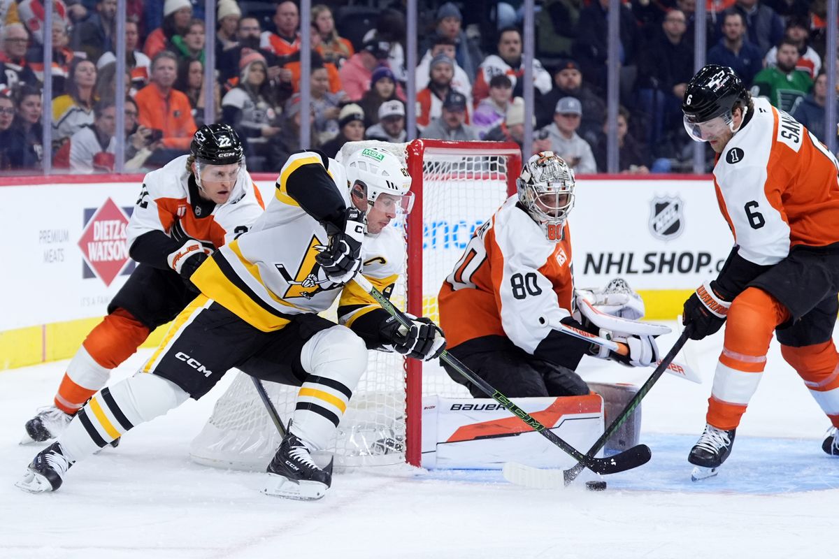 PHILADELPHIA (AP) — Pittsburgh star Sidney Crosby scored his 58th and 59th career goals against the Philadelphia Flyers and his continued excellence in the cross-state rivalry helped lead the Penguins to a 5-1 win on Monday night.