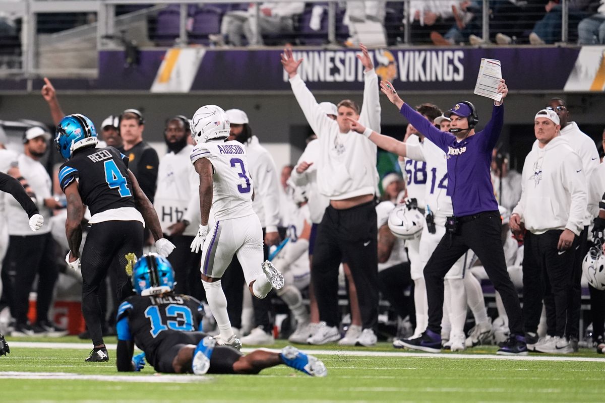 The Vikings had only 75 net yards before Addison took the ball and burst around the right end untouched for his longest career score, capping it with a dive at the pylon to make sure the ball got in as he was pushed out of bounds.