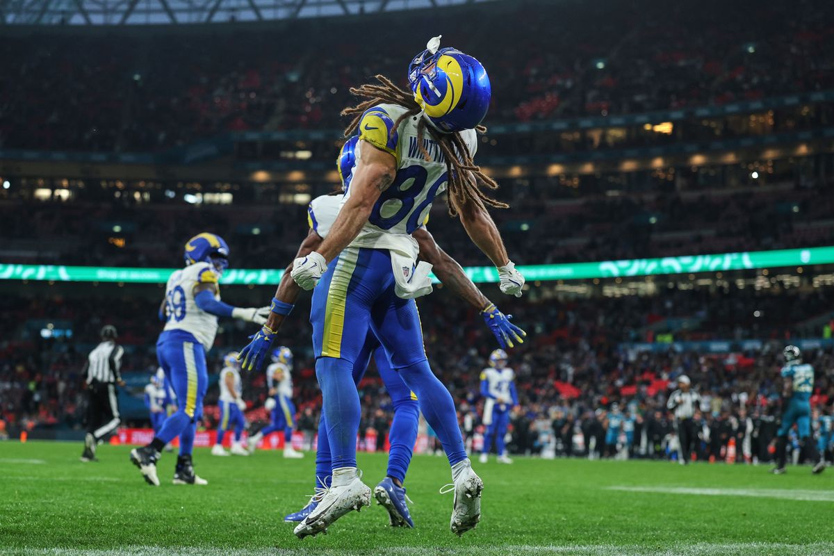 Stafford, who has thrown 12 touchdowns with no interceptions in his past four games, also connected with rookie receiver Konata Mumpfield and rookie tight end Terrance Ferguson in the London rout.