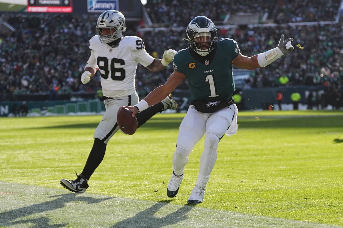 PHILADELPHIA (AP) — Jalen Hurts pointed at A.J. Brown — and just showed everyone watching, including a hapless defense — where he would throw the ball.
