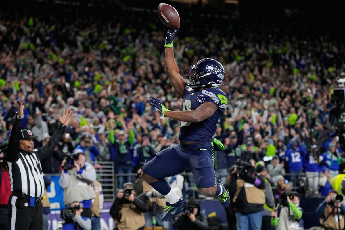 Walker’s three rushing touchdowns tied him with Shaun Alexander for the most in a playoff game in franchise history. Two of the scores came after halftime, and he celebrated one by chucking the ball into the crowd.