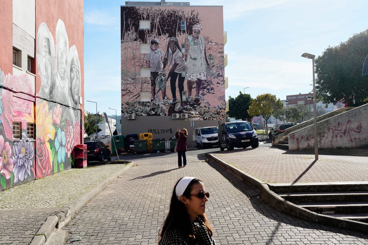 They are among a collection of giant murals at a housing project on the outskirts of the Portuguese capital Lisbon that tell tales of intimacy, resilience and sustainable living.